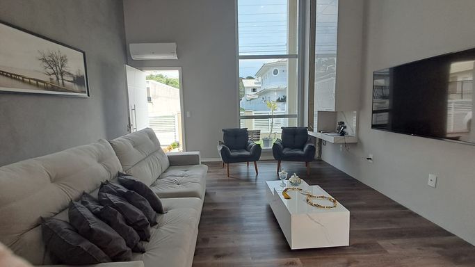 Casa no condomínio residencial Bosque das MansõesCasa de alto padrão com vista incrível em condomínio fechado! Conta com:- 4 dormitórios sendo: 2 suítes;- 6 banheiros;- 3 amplas salas;- escritório;- área de lazer interna com churrasqueira;- piscina;- cozinha externa com fogão semi industrial;- 3 vagas de garagem;- mini bosque com árvores frutíferas (araçá, limão, acerola, caqui e lichia);- jardim;- móveis planejados em todos os ambientes;- condomínio com total segurança; * aceita permuta * casa com escritura pública. Pode ser financiada! Agende uma visita e se surpreenda!! Para mais informações: (48) 98461-9948 Entre em contato e agende uma visita com um dos nossos corretores!